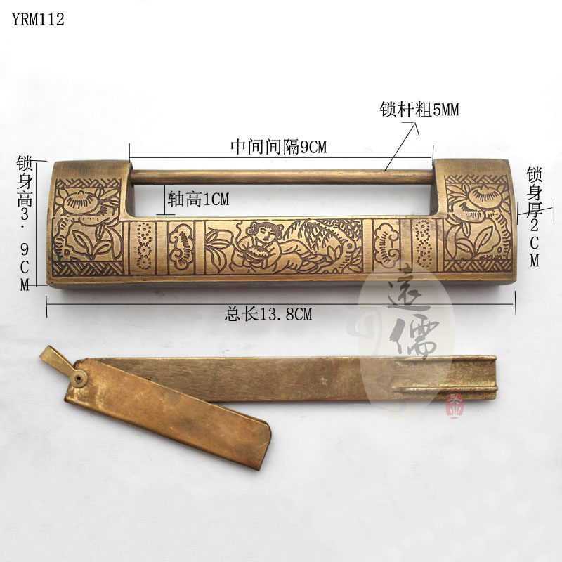 Yuan Ru YRM111 Chinese antique pure copper casting wooden box door horizontal opening padlock Vintage engraved vintage copper lock