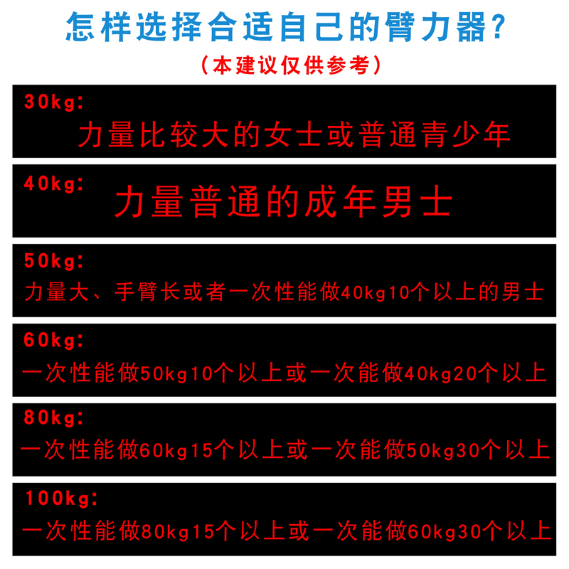 30kg 40kg 50kg 60kg 70kg (not recommended to buy if you have not used 60kg) 80kg (it is not recommended to buy if you have not used 70kg) 90kg (it is not recommended to buy if you have not used 80kg) 100kg (it is not recommended to buy if you have not used 90kg) 110kg (it is not recommended to buy if you have not used 100kg)