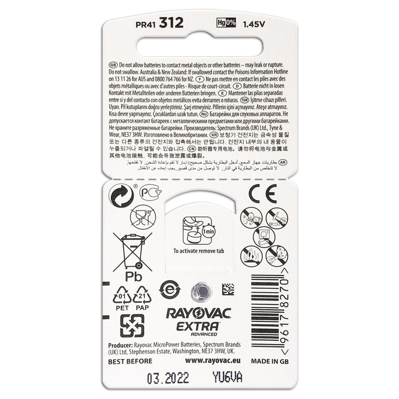 6 UK imported RTWA312 electronic hearing aid battery A312 battery PR44 ear