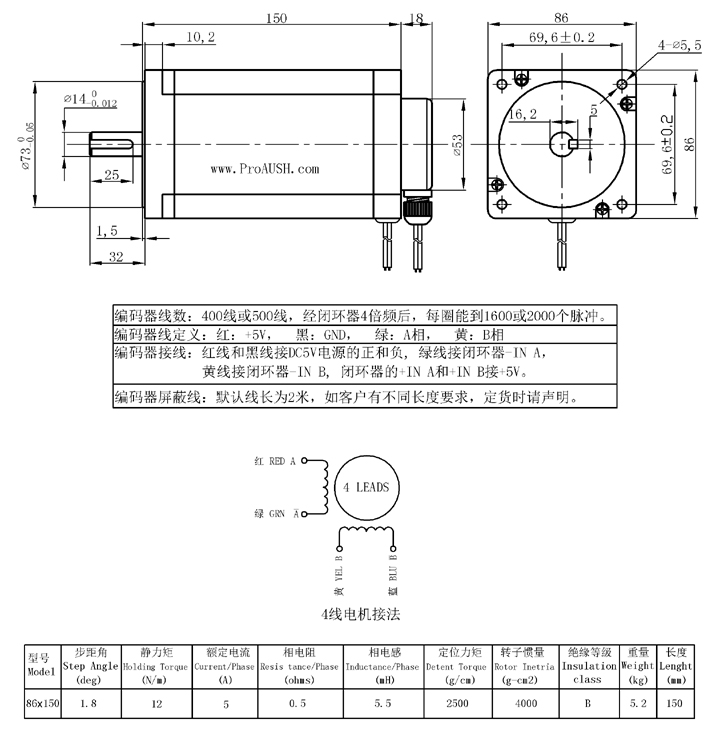 Lengthened 86x150 two-phase) two-phase stepper motor) with encoder 5A 12N m high speed type