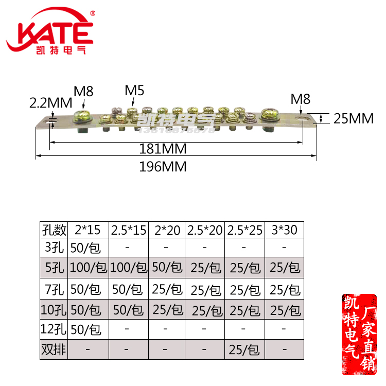 Double row 21 hole zero row 2 5*25 total length 196 brass zero ground row terminal bus copper row KT055