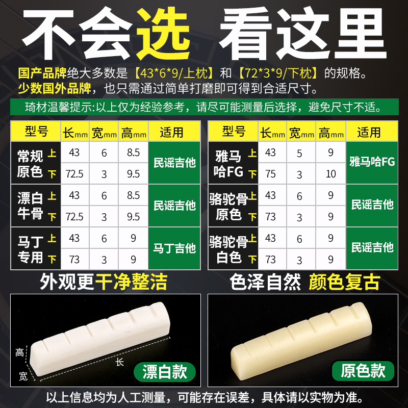Conventional bleached beef bone Single upper pillow + send sandpaper glue Conventional bleached beef bone Single lower pillow + send sandpaper Conventional primary color beef bone Single upper pillow + send sandpaper glue Toothed beef bone Single upper pillow + send sandpaper glue Conventional primary color beef bone Single lower pillow + send sandpaper Conventional primary color beef bone upper and lower pillow (set) + send sandpaper glue caliper Conventional bleached beef bone upper and lower pillow (set) + send sandpaper glue caliper Tooth original color beef bone upper and lower pillow (set) + send sandpaper glue caliper Martin guitar model beef bone upper and lower pillow (set) + send sandpaper glue caliper Yamaha FG beef bone upper and lower pillow (lower pillow length 75mm) (set) + send sandpaper glue caliper (camel bone) primary color upper and lower pillow (set) QC0271 unpolished + send sandpaper glue caliper (camel bone) original color upper and lower pillow (set) QC0272 polishing + sandpaper glue caliper conventional bleached beef bone upper and lower pillow + piano pillow grinder + send sandpaper glue caliper toothed primary color beef bone upper and lower pillow + piano pillow grinder + send sandpaper glue caliper Conventional original color beef bone upper and lower pillow (set) + ebony string cone + giveaway Regular Original Color Beef Bone Upper and Lower Pillow (Set) + Three-in-One StringEr + Giveaway Regular Primary Color Beef Bone Upper and Lower Pillow (Set) + All-In Hex Wrench + Giveaway Conventional Original Color Beef Bone Upper and Lower Pillow (Set) + Silk Derusting Eraser + Giveaway Regular Original Color Beef Bone Upper and Lower Pillow (Set) + Four-Sided Grinding Block + Giveaway Regular Original Color Beef Bone Upper and Lower Pillow (Set) + String Oil Wipes (20 Pieces) + Giveaway Regular Original Color Beef Bone Upper and Lower Pillow (Set) + Guitar Special Cleaning Cloth (12 Pieces) + Gift Regular Original Color Cow Bone Upper and Lower Pillow (Set) + Alice Guitar String + Giveaway Yamaha FG double compensation cow bone pillow + send sandpaper