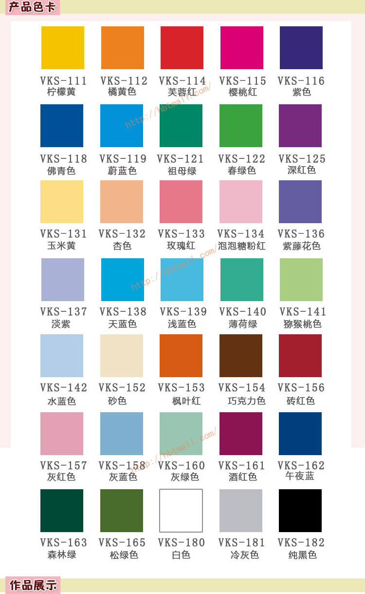 VKS-140 mint green VKS-141 chic exotic fruit color VKS-142 water blue VKS-152 sand color VKS-153 maple leaf red VKS-154 chocolate