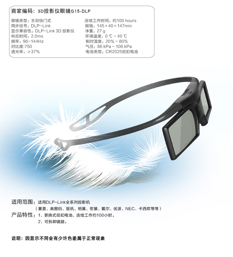 The Broadbest G15-DLP Shutter 3D Glasses support all DLP-LNIK 3D projectors