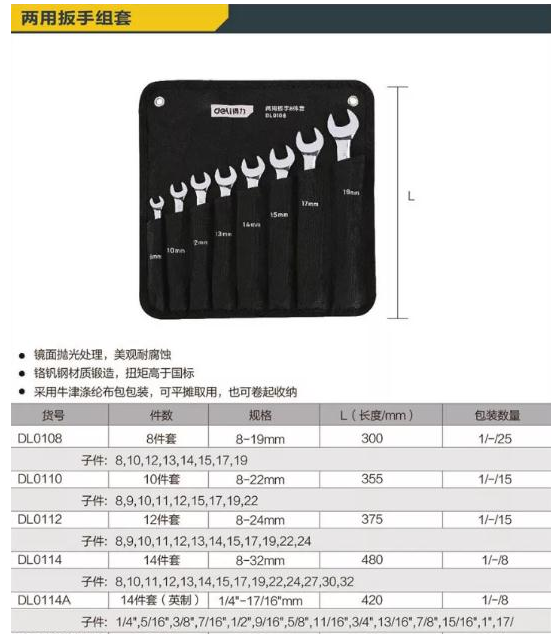 Deli fully polished dual-purpose wrench set with two plum openings 10 12 14-piece set 8-32