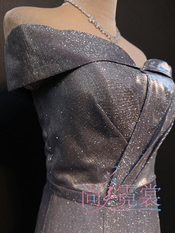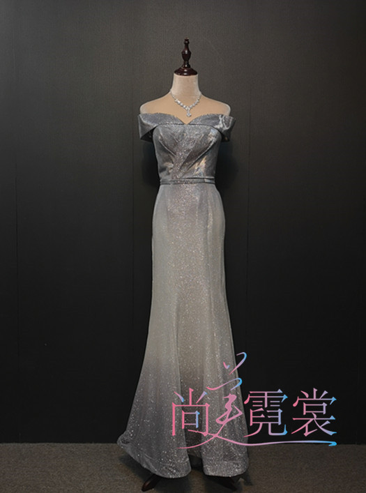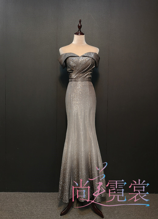 Grey Asymptotic Fish Tail Sashimi Shoulder Evening Dress evening dress Annual Meeting Gala Presenter Gown in Beijing Custom Leasing