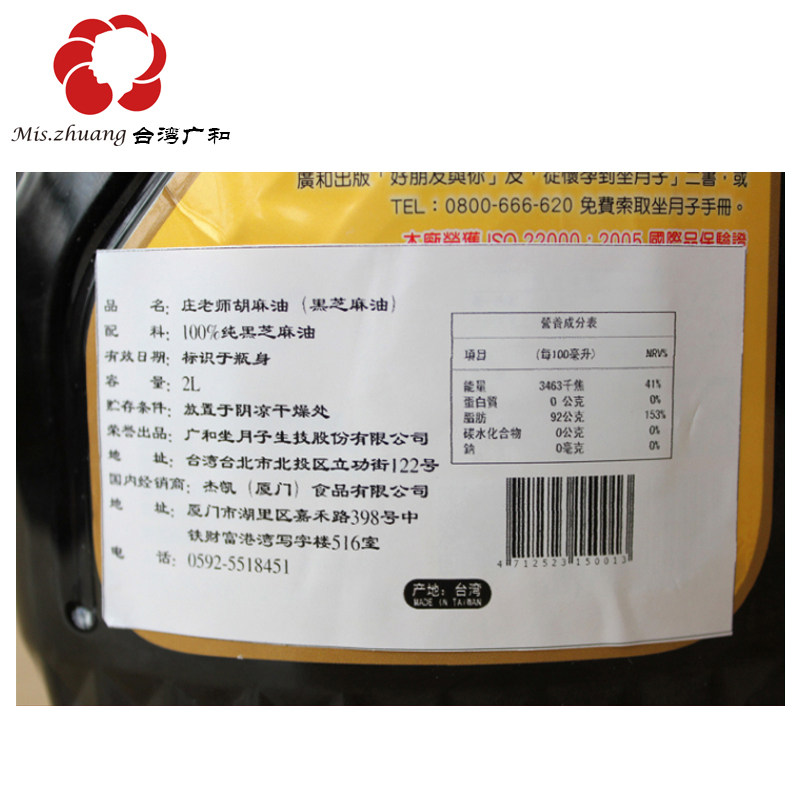 Taiwan Guanghe flax oil Maternal confinement special oil during menstruation Cold pressed black sesame oil A bottle of 4 kg