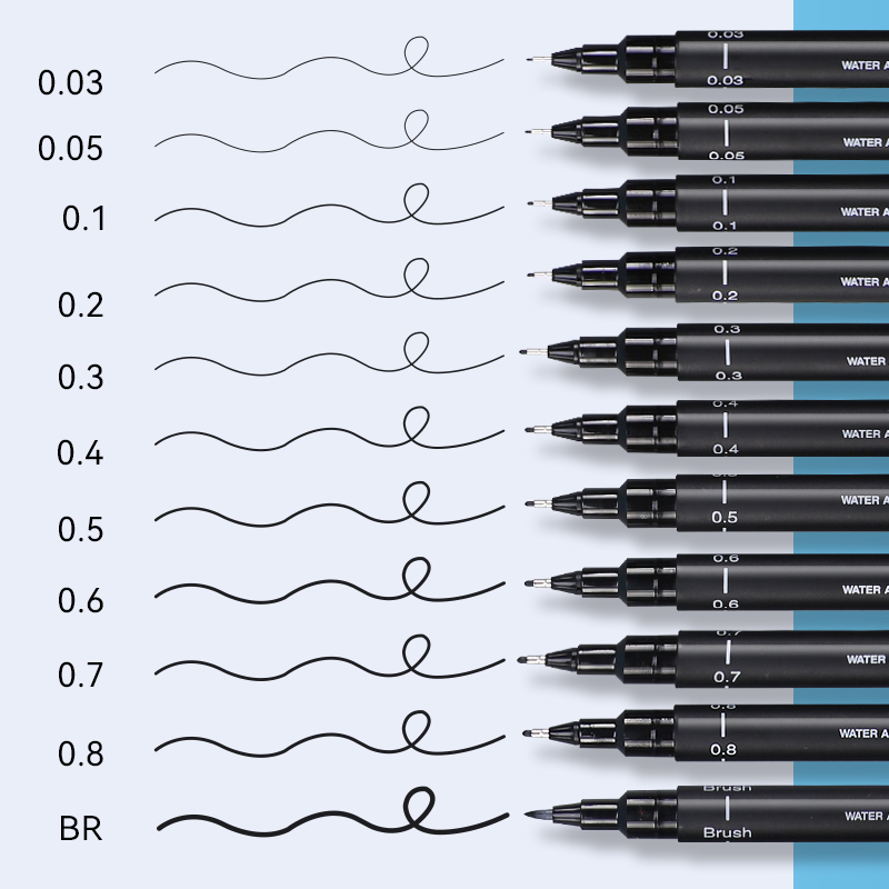 0.1mm 0.2mm 0.3mm 0.4mm 0.5 mm 0.6mm 0.7mm 0.8 mm BRUSH soft head (suitable for large-area coloring) Basic 2 packs Common 3 packs Common 5 packs Full set 7 packs 003 3pcs 01 3pcs 02 3pcs 03 3pcs 05 3pcs 08 3pcs 003 6pcs 005 6pcs 01 6pcs 02 6pcs 03 6pcs 05 6pcs 05 6pcs 08 6pcs 08 6pcs 00. 03mm 0.05mm 0.1mm Brown 0.5mm Brown 0.28mm Dark Grey 0.28mm Light Grey 01#Blue 02#Blue 03#Blue 05#Blue 08#Blue 02#Red 03#Red 05#Red 08#Red (Beveled nib)10mm Black (Beveled nib)20mm Black (Beveled nib)30mm Black (fine brush nib)BR soft head#Black
