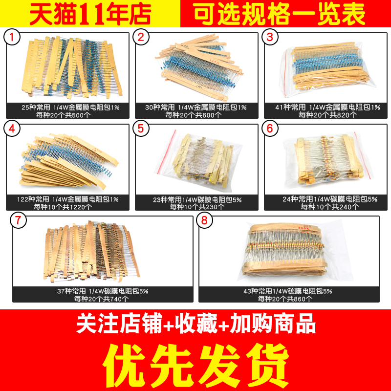25 commonly used 1 4W metal film resistor packs 1% 20 per type, a total of 500(1 pack) 30 commonly used 1 4W metal film resistor packs 1% 20 per type, a total of 6