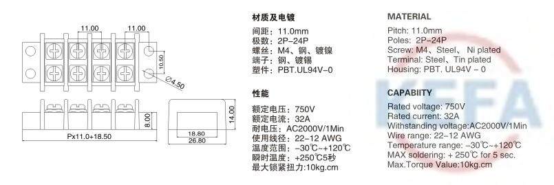 Fence-type wiring terminals KF69-11 0mm Double-row without weld-in-wire Hair Wiring terminal Dingding
