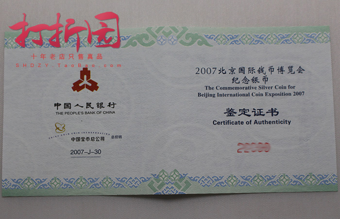 2007 Beijing International Coin Expo silver coin 07 Expo silver coin fidelity with certificate