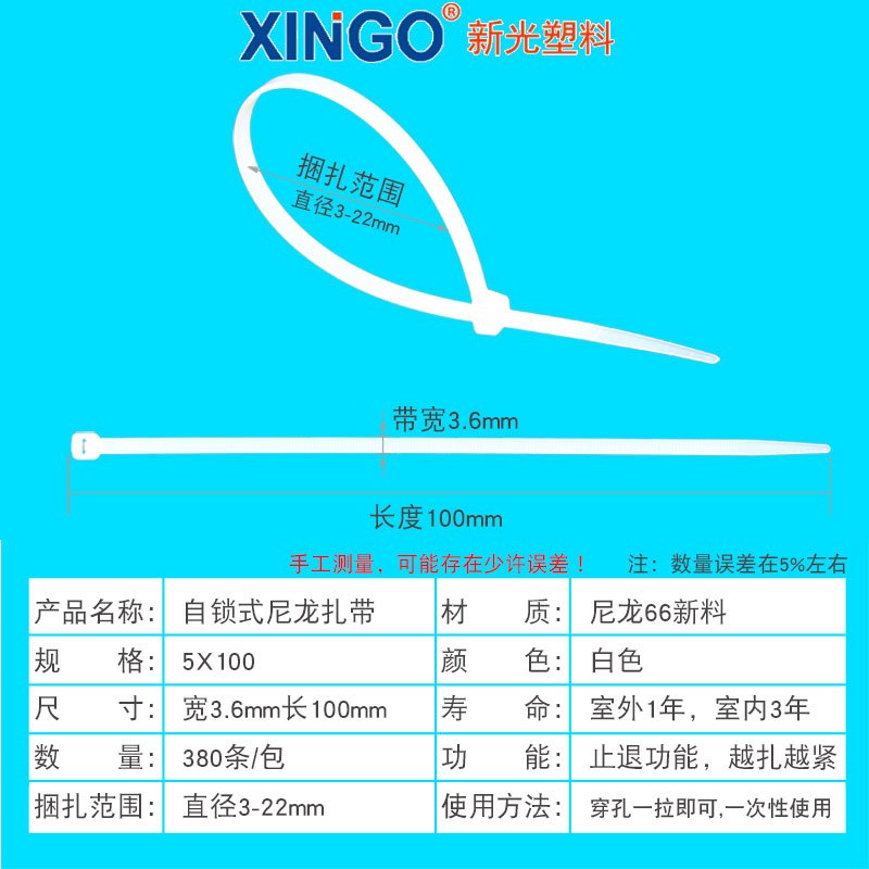 Xinguang 5*100mm self-locking nylon cable tie white plastic strapping fixed bundle wire management strap 380