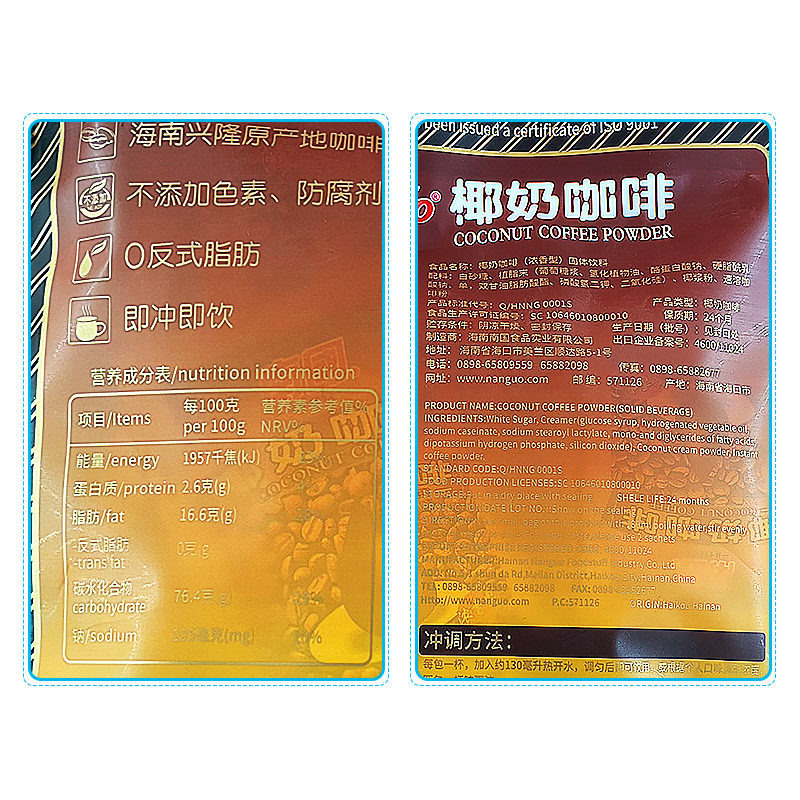 Hainan Specialty Nanguo Coconut Milk Coffee 340g×2 Bags Strong Flavor Instant Coffee Powder