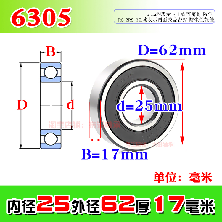 Deep ball rolling bearing 6305RS 2RS 6305 2RZ 2RZ 6305Z ZZ inner diameter 25 outer diameter 62 62 17mm