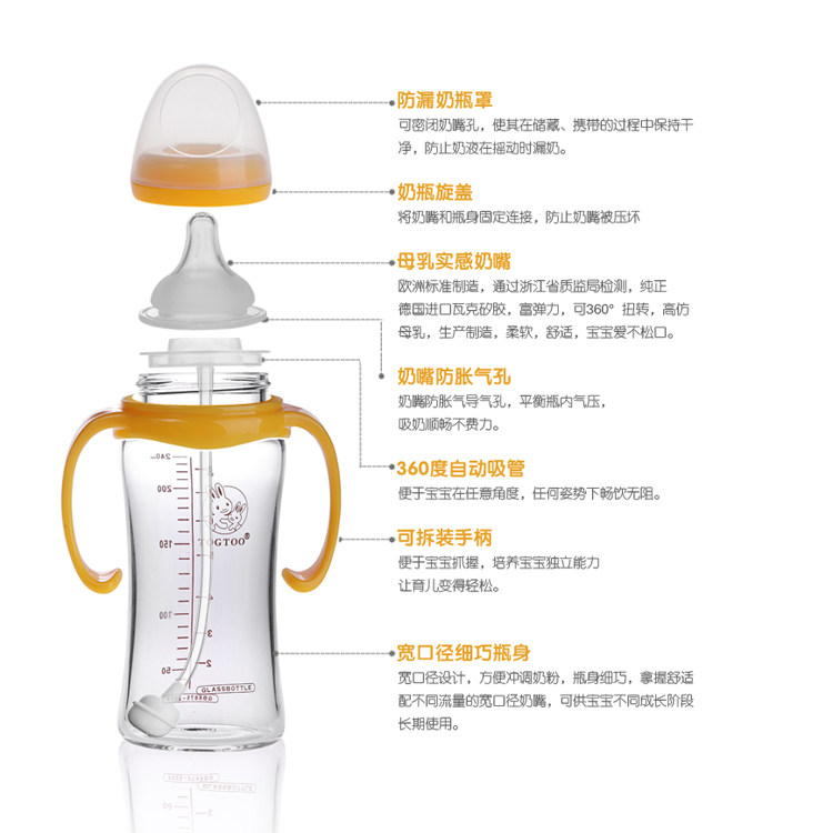 Newborn baby baby products Naughty rabbit wide diameter glass bottle 160 240 ML with straw handle