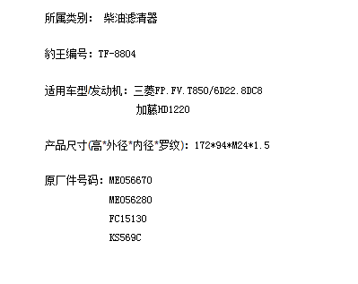 TF-8804 for Mitsubishi Kato HD1220 Carter ME056670 ME056280 Diesel Filter