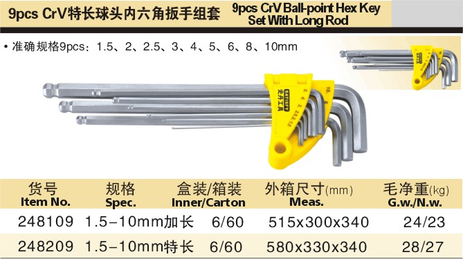 Stan 9-piece chrome vanadium steel ball head extended long hex wrench 248109 248209