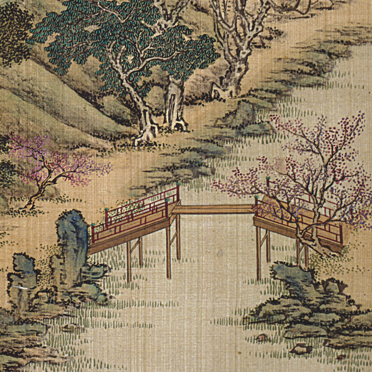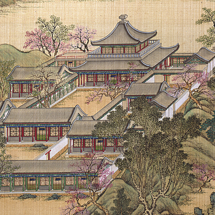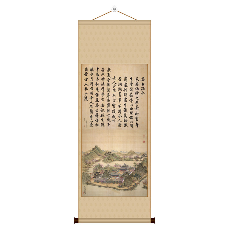 Ru Guhanjin four-foot canvas strip vertical axis Yuanmingyuan antique pavilion building landscape soft mounted calligraphy and painting Tang Dai