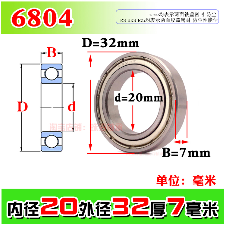 Deep groove ball thin-walled small bearing 6804Z ZZ 6804RS 61804ZZ inner diameter 20mm outer diameter 32 thickness 7mm