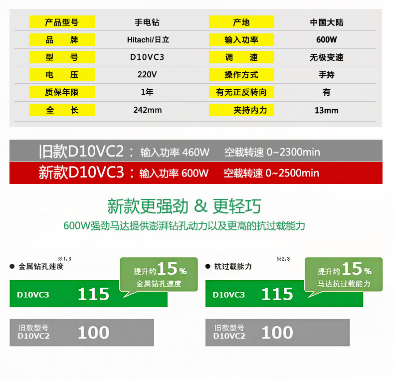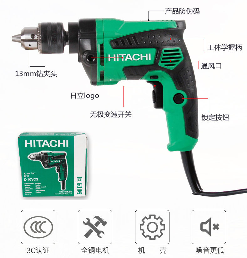 HITACHI HITACHI electric drill D10VC2 D10VC3 13mm speed regulation forward and reverse power tool High One