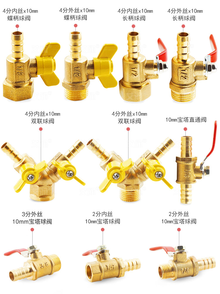 10mm pagoda straight through valve (#2-151) 4 outer silk * 10mm long handle ball valve (#2-150) 4 parts outer silk * 10mm butterfly handle ball valve (#2-153)