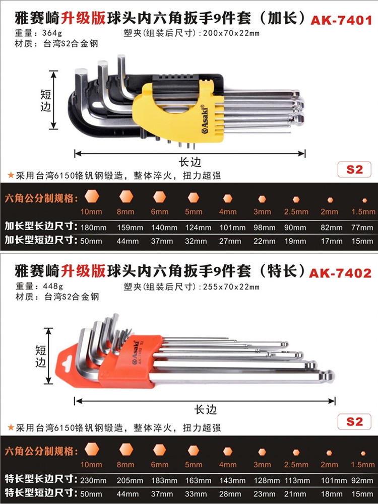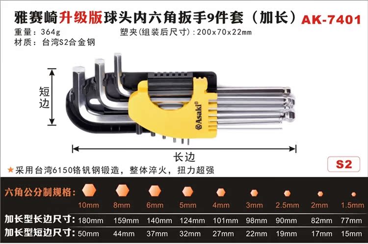 Yasaizaki 9PCS white upscale S2 male system suit lengthened special head ball head inner hexagon wrench AK-7401-Taobao