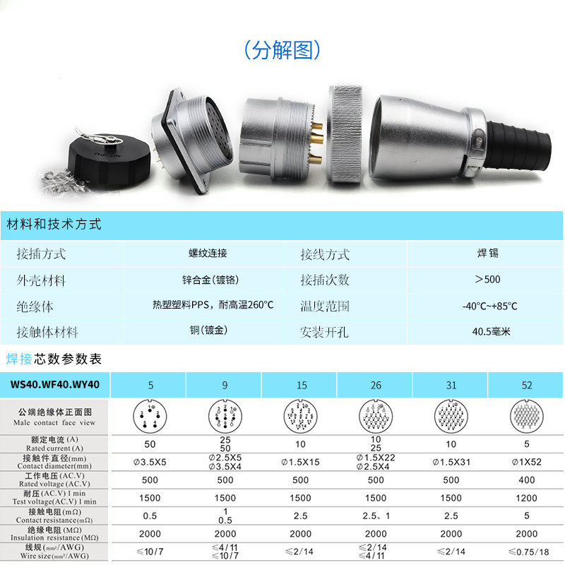 Weipu aviation plug socket WS40-5 core 9 core 15 core 26 core 31 core cable type