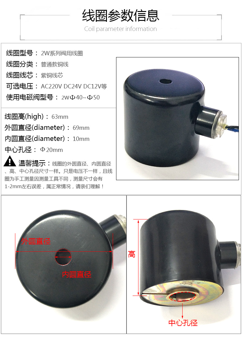 2W series solenoid valve coil Large copper coil aperture 20mmAC22OV DC24V AC110V AC380V