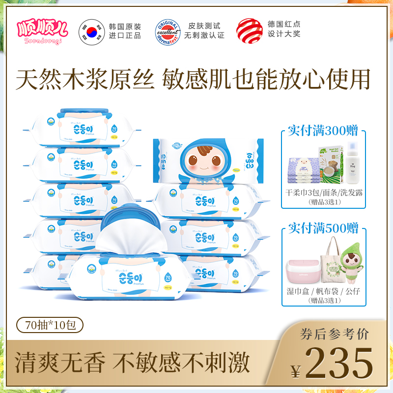 Shunshuner Korea imported baby hand and mouth special wet wipes Baby wet wipes Fragrance-free wet wipes blue 10 large packs