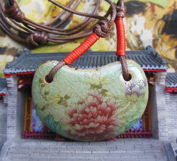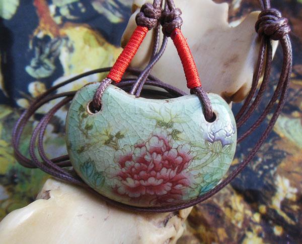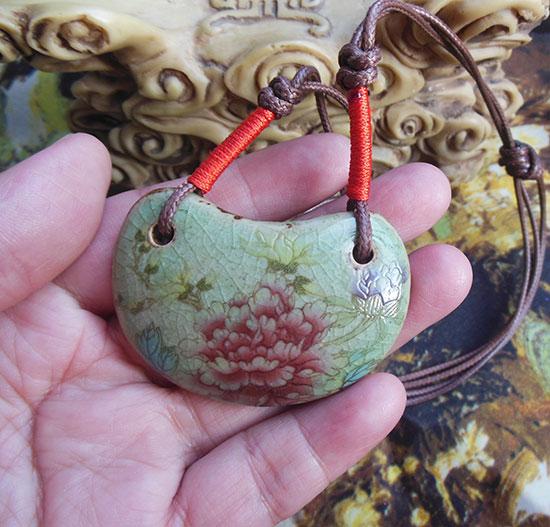 Pure hand painted shallow relief powder color out of water hibiscus old porcelain piece necklace (with opening sheet) -Taobao