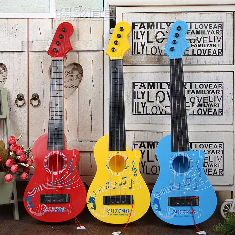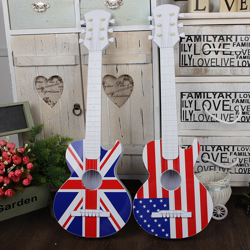 Red wood beige wood sunset yellow wood white wood plastic American flag guitar plastic British flag guitar