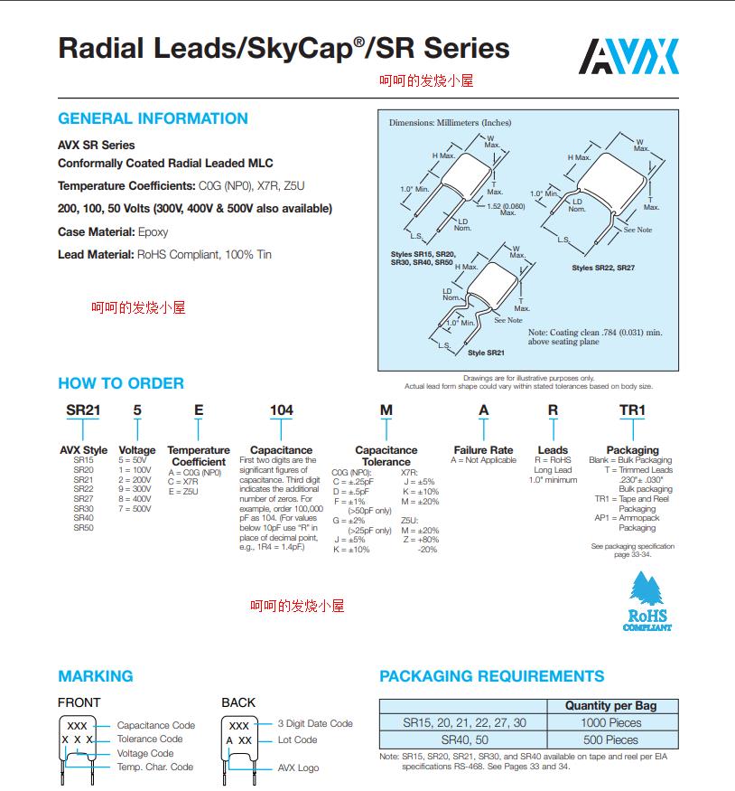 AVX 220PF C0G NP0 SR212A221 KAATR1 Ceramic Multilayer Fixed Capacitor
