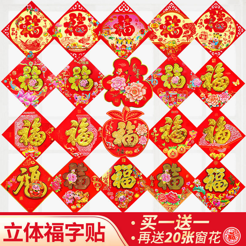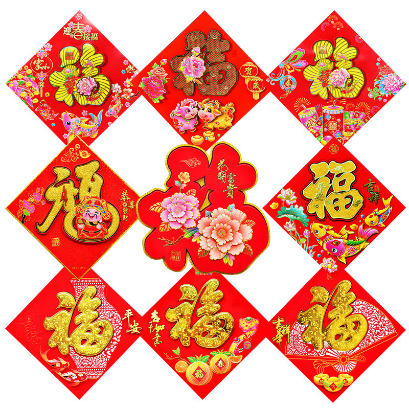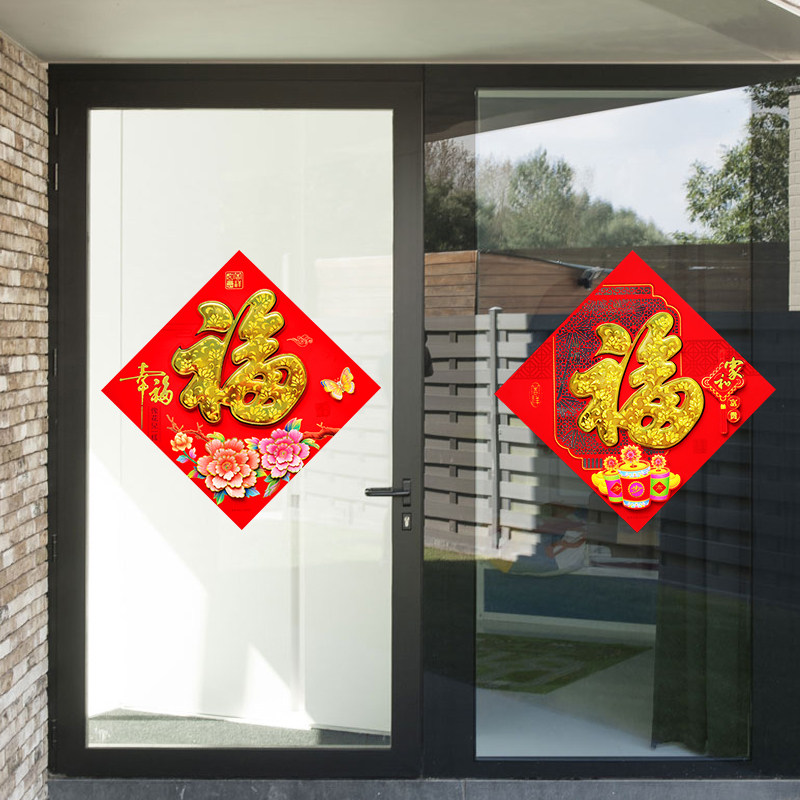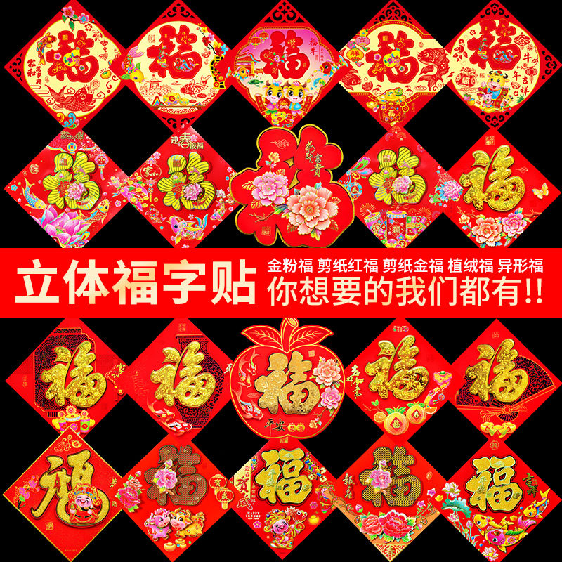 Fu character door stickers for the Year of the Ox Spring Festival decoration supplies New Year window grilles 2022 three-dimensional New Year New Year goods scene layout