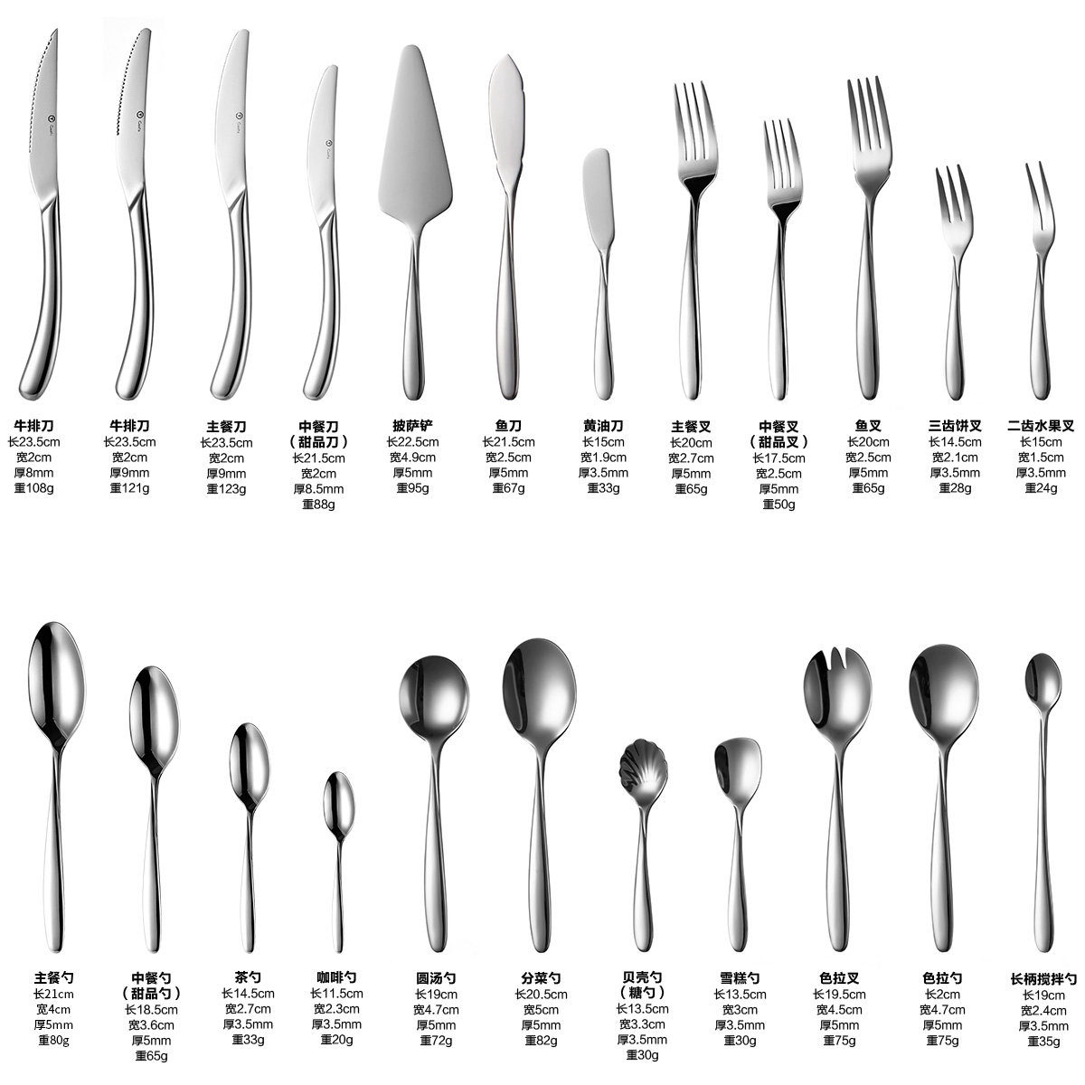 Pointed Steak Knife Round Steak Knife Main Meal Knife Dessert Knife Main Meal Fork Dessert Fork Main Meal Spoon Dessert Spoon Tea Spoon Coffee Spoon Round Soup Spoon Long Handled Stirring Spoon Butter Knife Two-toothed Fruit Fork Ice Cream Spoon Sugar Spoon Three-toothed Cake Fork Salad