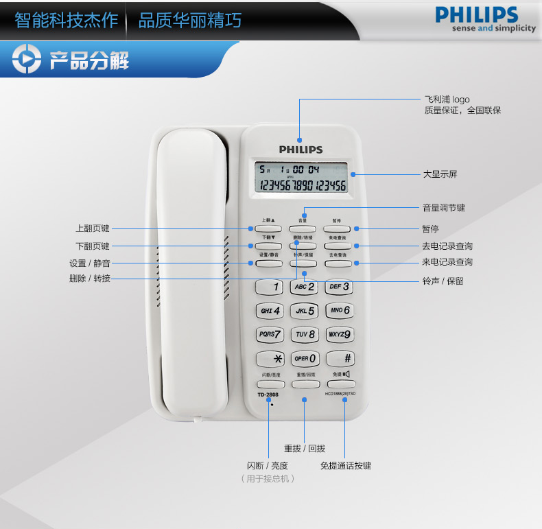 Philips phone TD-2808 to be free of battery to show hands-free home landline office landline landline