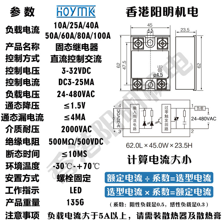 Yangming Single-phase DC AC Solid-State Relay SSR10 25 40 50 60 80 100a DA