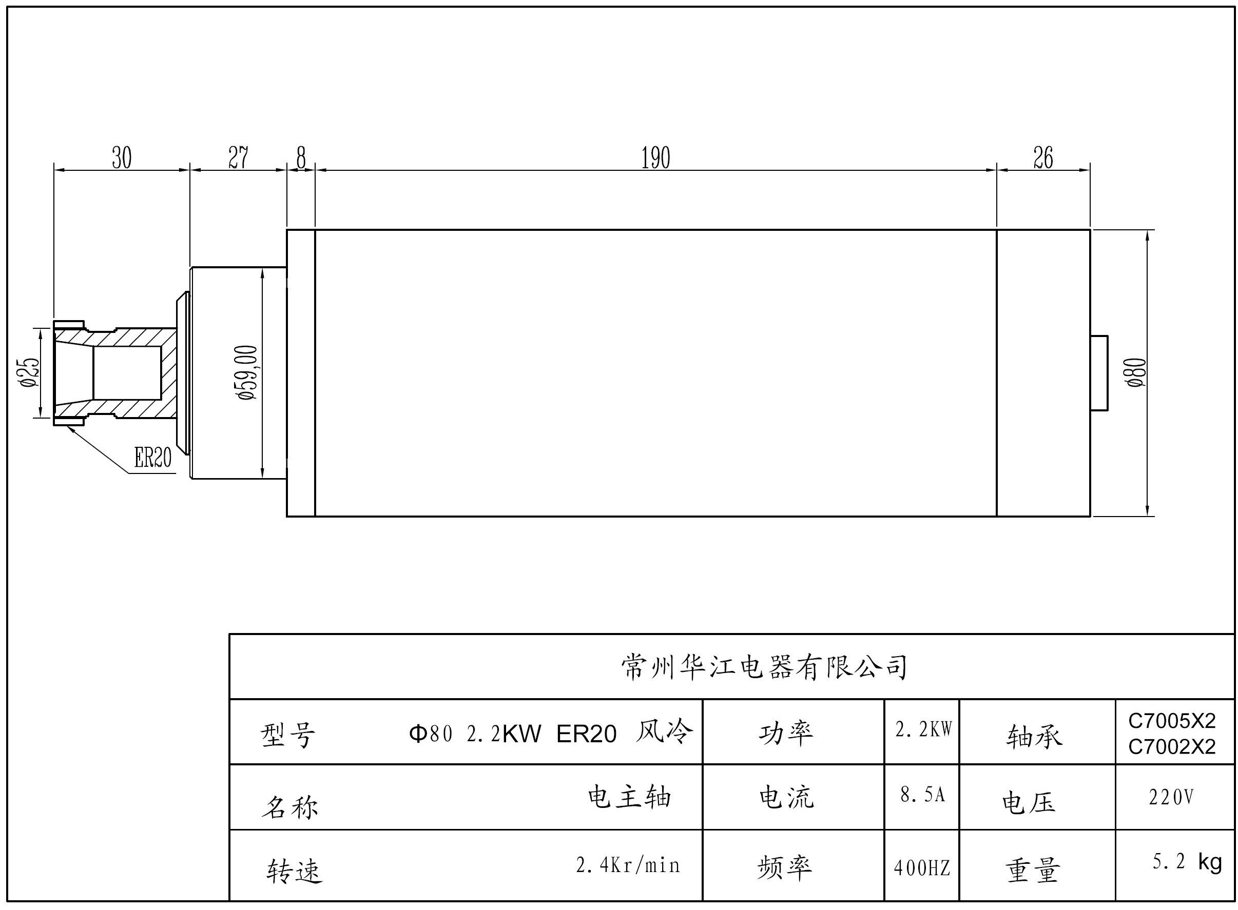 Huajiang air-cooled electric spindle 80*2 2kw ER20 machine warranty for one year, bearings for half a year