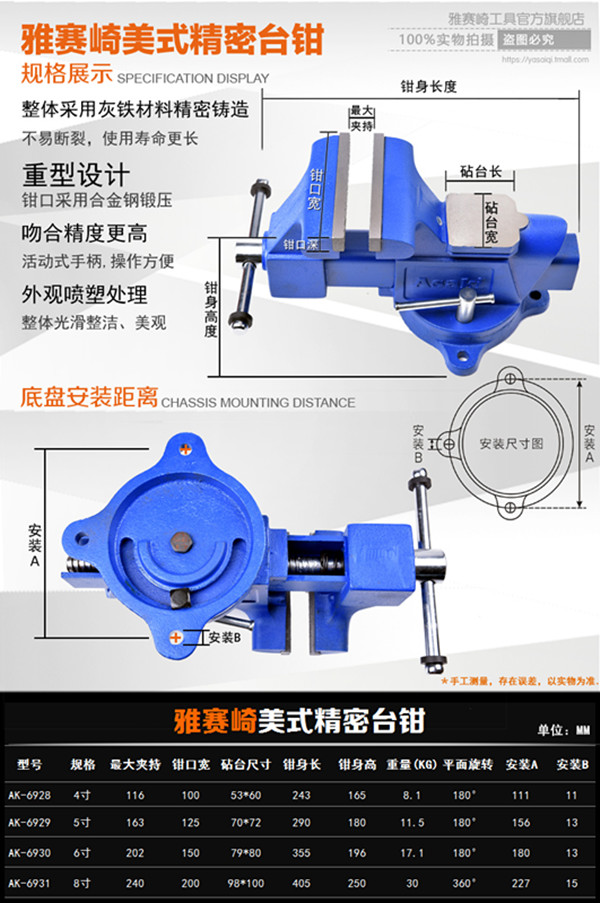Hong Kong Yasaiqi 4 inch-8 inch American precision vise bench vise working flat pliers AK-6928 series