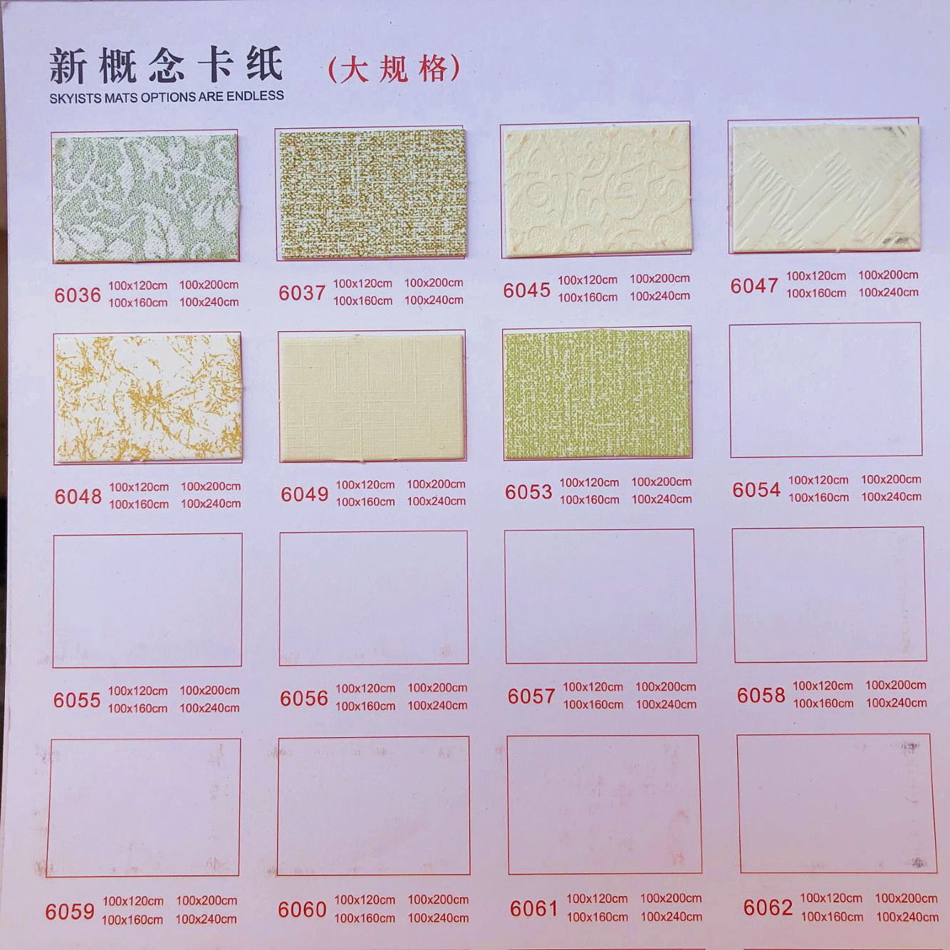 1 m * 1 2 m Puka (40 sheets * RMB10 ) 1 m * 1 6 m Puka (40 sheets * 13) 1 m * 2 m Puka (40 sheets * 15) 1 m * 2 4 m Puka (