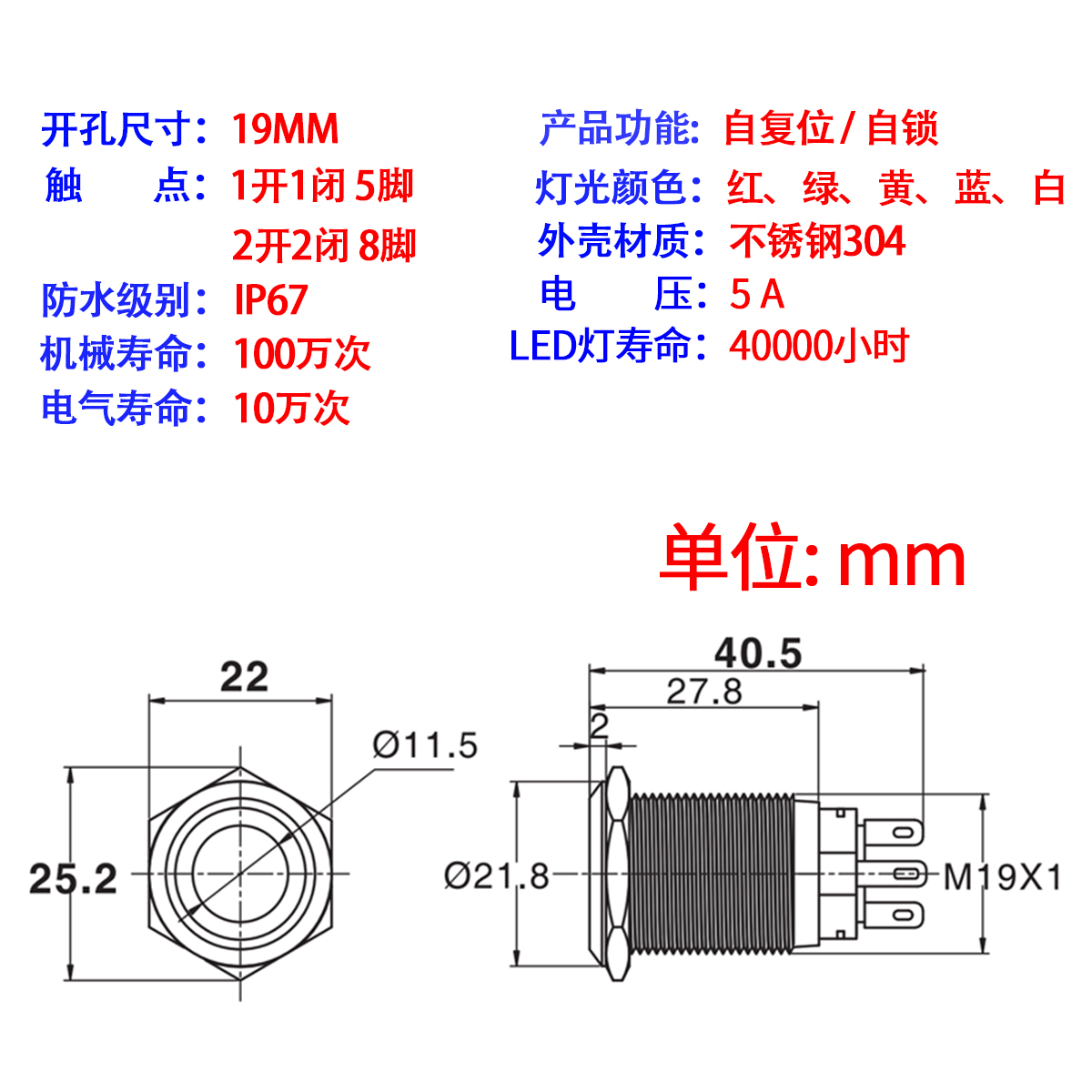 Jinhong 19MM metal button switch reset self-lock waterproof power startup 2 open 2 closed single double group J19-271