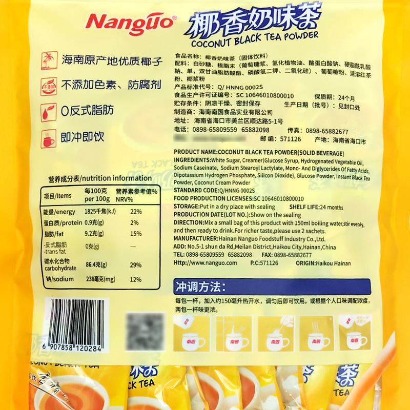 White sugar non-dairy powder (glucose syrup hydrogenated vegetable oil sodium stearoyl lactylate sodium mono-diglyceride fatty acid ester dipotassium hydrogen phosphate silicon dioxide) glucose powder instant black tea powder coconut milk powder