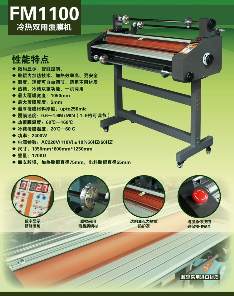 FM-1100 internal heating digital laminator cold heat mounting double use with foot rest width 1 05 m four rollers