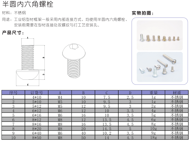 Industrial Aluminum Squeeze Type Material Accessories Semicircle Head Inner Hexagon Bolt Inner Hexagon Screw Model Complete