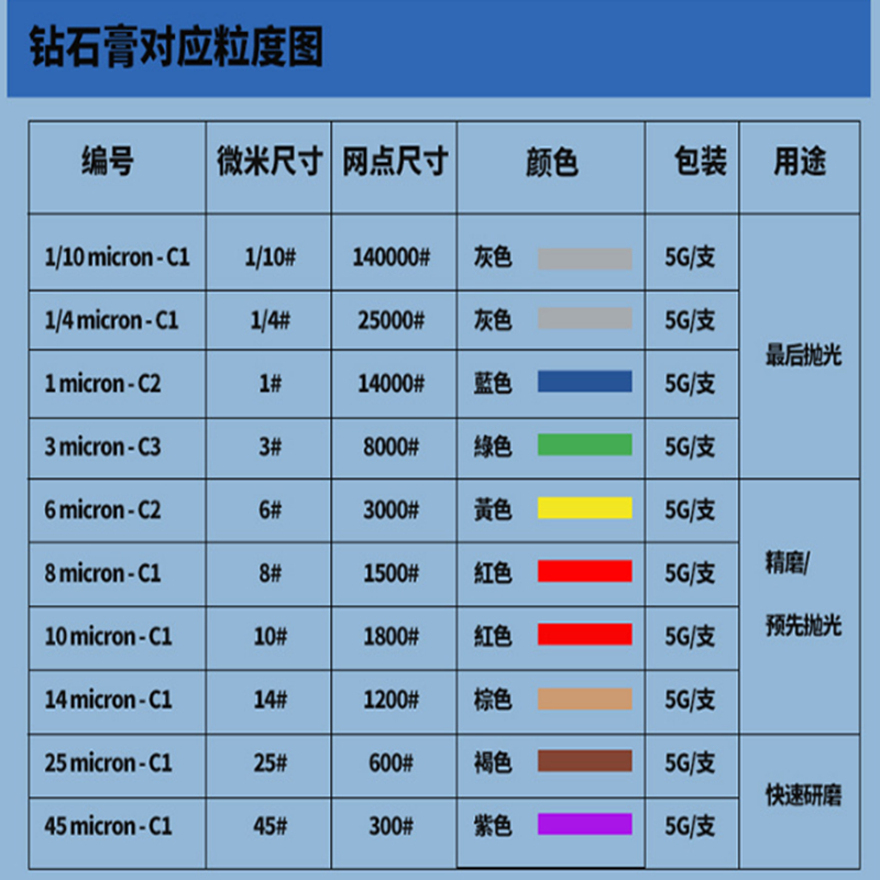 1# blue 14000 mesh, 3# green 8000 mesh, 6# yellow 3000 mesh, 10# red 1500 mesh, 14# brown 1200 mesh, 25# brown 600 mesh, 45# purple 300 mesh, 1 10# grey 140000 mesh, 14# grey