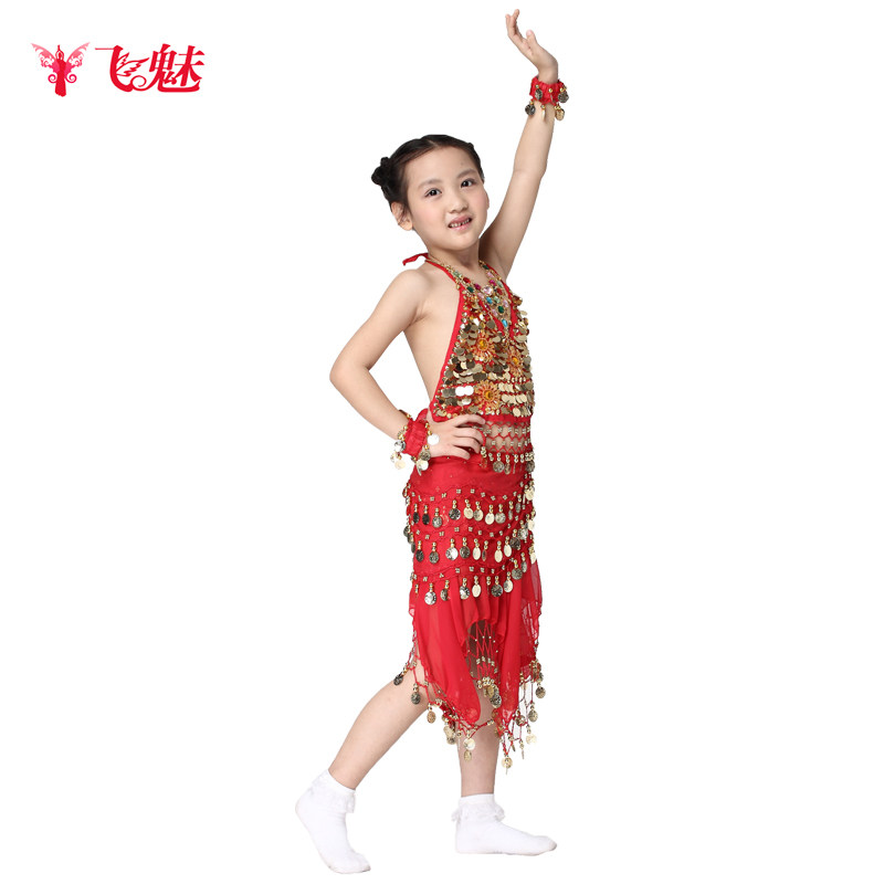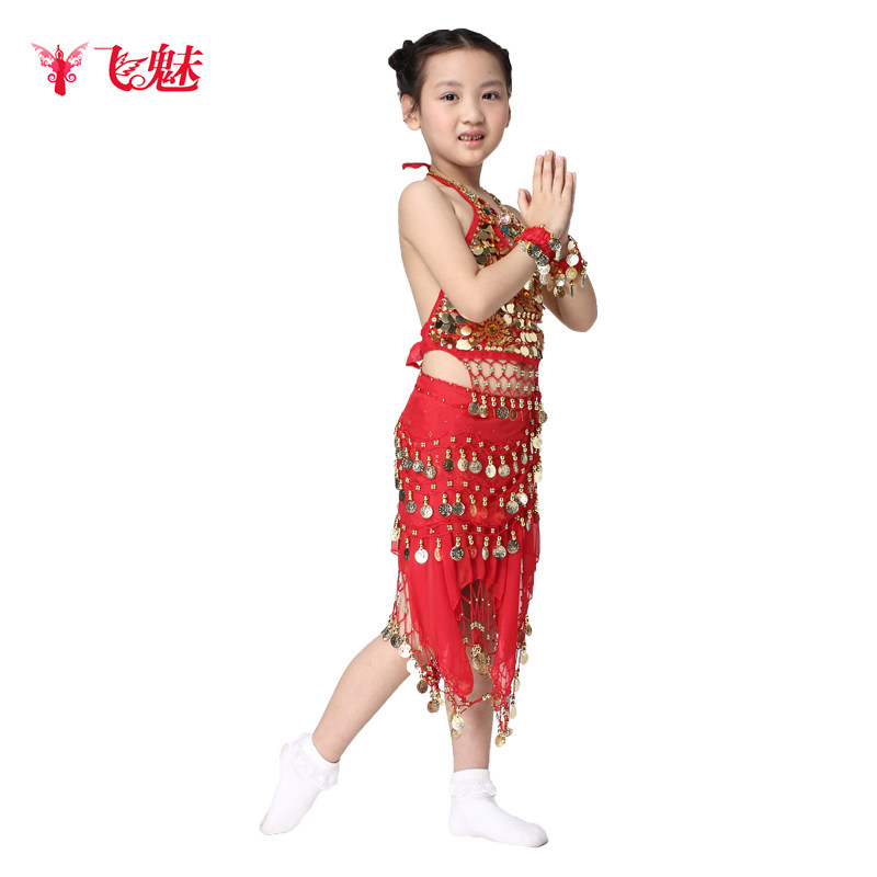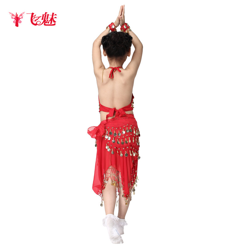 Flying charm children's belly dance set practice suit three-piece set of five flower tops + chiffon skirt + gold coin waist chain