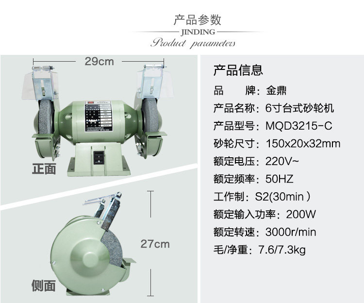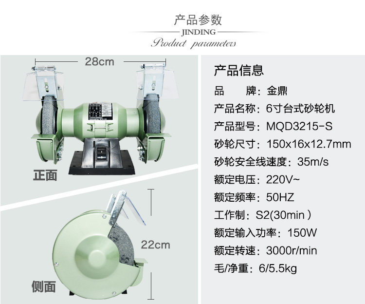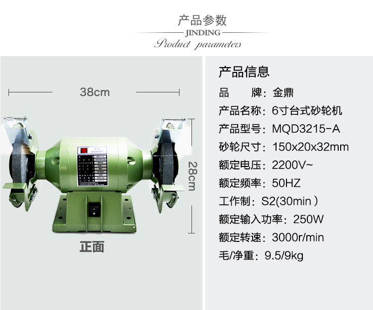 Jinding MQD3215-C single phase protective desktop grinding wheel machine 6 inch (150mm) 200W 150W 250W