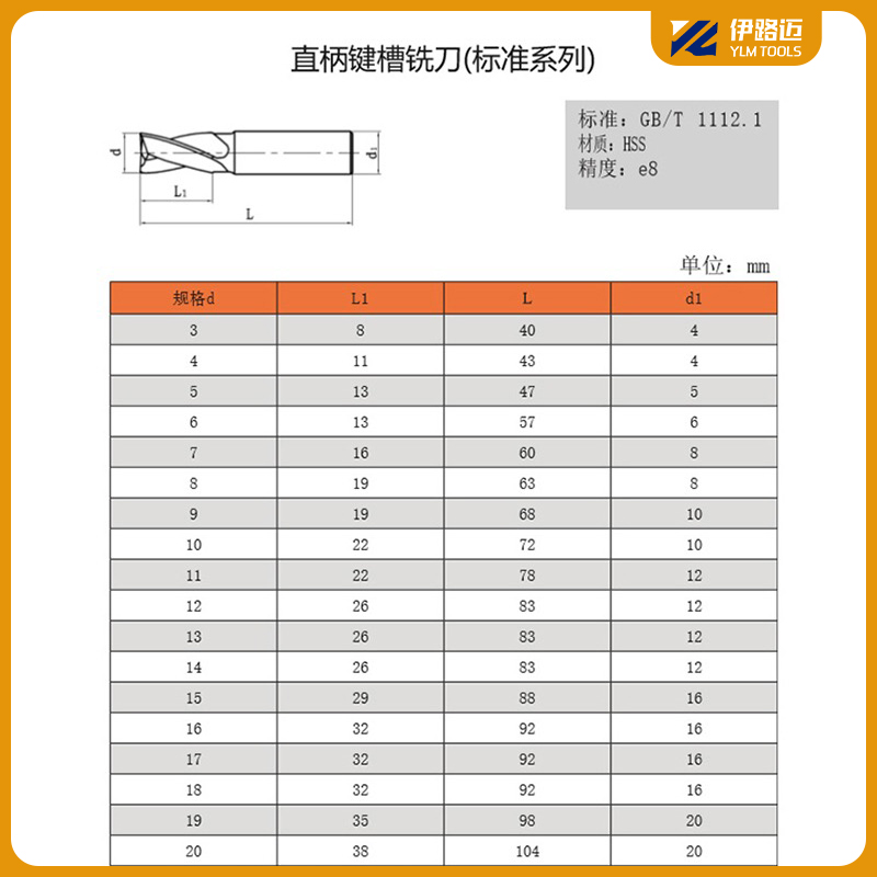 Upper work straight shank keyway milling cutter 3 4 5 6 8 10 12 12 18 18 20 20 speed mesh straight shank two-edge milling cutter