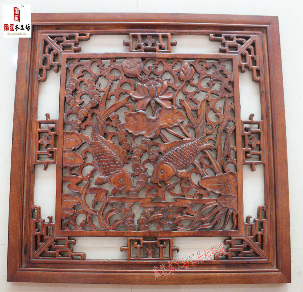 East Yang Wood Carving Chinese Background Wall Pendant Wall Hanging Wall-hanging Square 80cm Lotus Carp Wood Carving Craft Gift Hem