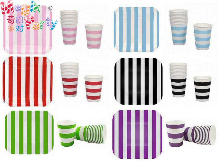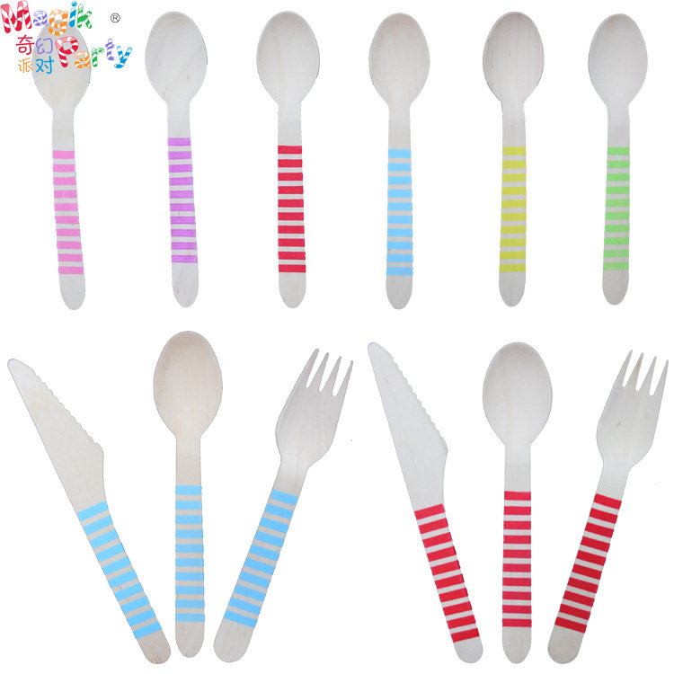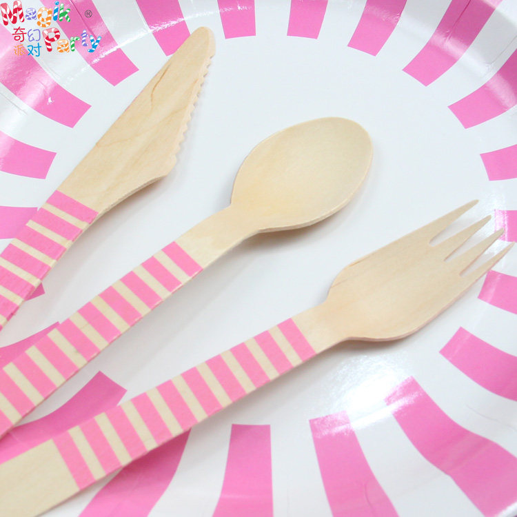 Sky blue cup Sky blue dish Sky blue paper towel Wooden knife (please note color) Wooden fork (please note color) Wooden spoon (please note color) Green cup Green dish Purple cup