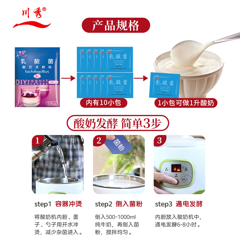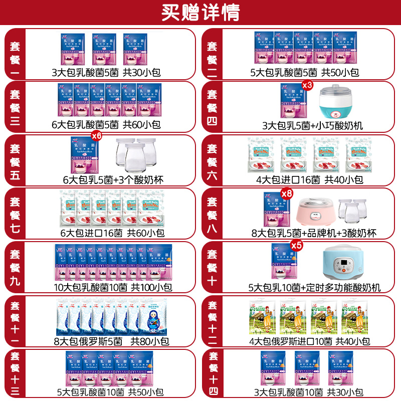 Package 1 3 large bags of classic lactic acid bacteria 5 bacteria (a total of 30 small packets) package 12 4 large bags of Russian imported 10 bacteria (a total of 40 small packets) package 3 6 large bags of classic lactic acid bacteria 5 bacteria (a total of 60 small packets) package 2 5 large bags of classic lactic acid bacteria 5 bacteria (a total of 50 small packets) set 15 12 large bags of classic lactic acid bacteria 5 bacteria (a total of 120 small packets) package 16 20 large bags of classic lactic acid bacteria 5 bacteria (more cost-effective) package 14 3 large bags upgrade lactic acid bacteria 10 bacteria (a total of 30 small packets) package 13 5 large bags upgrade lactic acid bacteria 10 bacteria ( A total of 50 small packets) Set Nine 10 large bags of upgraded lactic acid bacteria 10 bacteria (a total of 100 small packets) Package six 4 large bags of imported 16 bacteria (a total of 40 small packets) Package seven 6 large bags of imported 16 bacteria (a total of 60 small packets) Package five 6 large bags of lactic acid bacteria 5 bacteria + 3 150ml yogurt cups Package four 3 large bags of lactic acid bacteria 5 bacteria + small stainless steel yogurt machine Package 17 6 large bags of lactic acid bacteria 5 bacteria + 304 steel brand yogurt machine Package eight 8 large bags of lactic acid bacteria 5 bacteria + brand yogurt machine + 3 150ML yogurt cups Package ten 5 large bags of lactic acid bacteria 10 bacteria + timed multi-function yogurt machine Package 11 8 large bags of Russian 5 bacteria (limited promotion) Mantou yeast powder 5g * 15 bags (steaming cloth) 5g * 50 bags of steamed yeast powder (limited) Danish imported strains Safety and health Bacteria full upgrade Increase the amount without adding price More comprehensive Nutrition more comprehensive Fermentation success rate is higher
